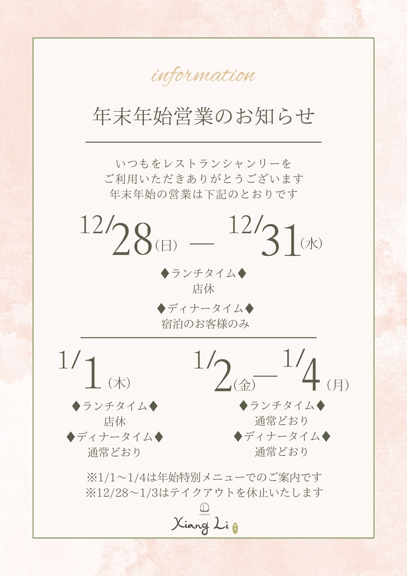 2025.12.28~2026.1.4 シャンリー年末年始営業のお知らせ
